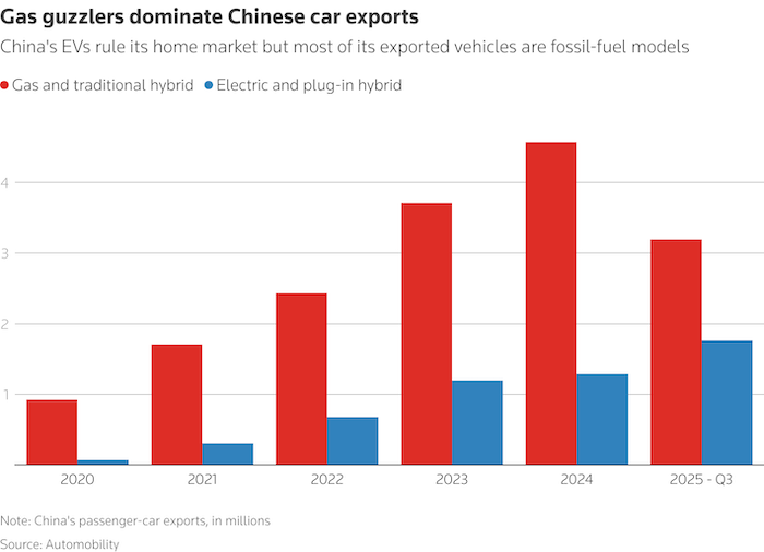 Fossil-fuel vehicles have accounted for 76% of Chinese auto exports since 2020, and total annual shipments jumped from 1 million to likely more than 6.5 million this year, according to data from China-based consultancy Automobility.