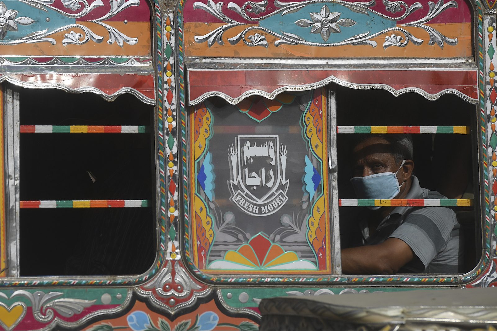 Passengers wearing masks sit on a bus in Karachi on June 8, 2020. Photo: AFP/ Asif Hassan