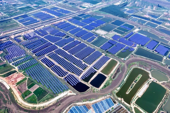 An aerial view shows the agricultural solar project in the West Coast New Area in Daoerhe village in Qingdao, Shandong province, China, on August 20, 2025. (Costfoto/NurPhoto via Reuters).