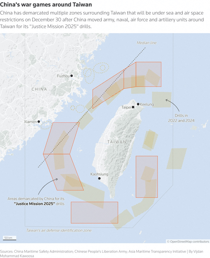 Map showing multiple zones around Taiwan marked by China for December 30 military drills, and past drill areas (Reuters).
