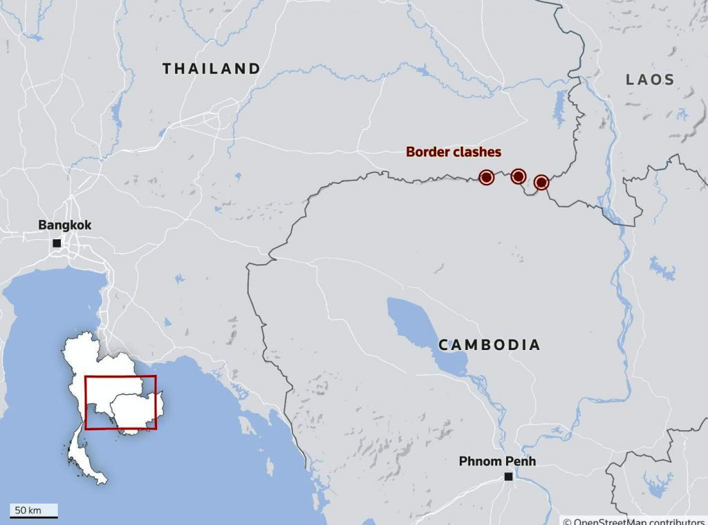 At least one Thai soldier was killed and eight wounded in the fresh clashes that intensified around 5am local time (2200 GMT), a Thai army spokesperson told Reuters. These locations are a long way from Bangkok and Phnom Penh, but tens of thousands of civilians living on both sides of the border had to be evacuated to safer locations.